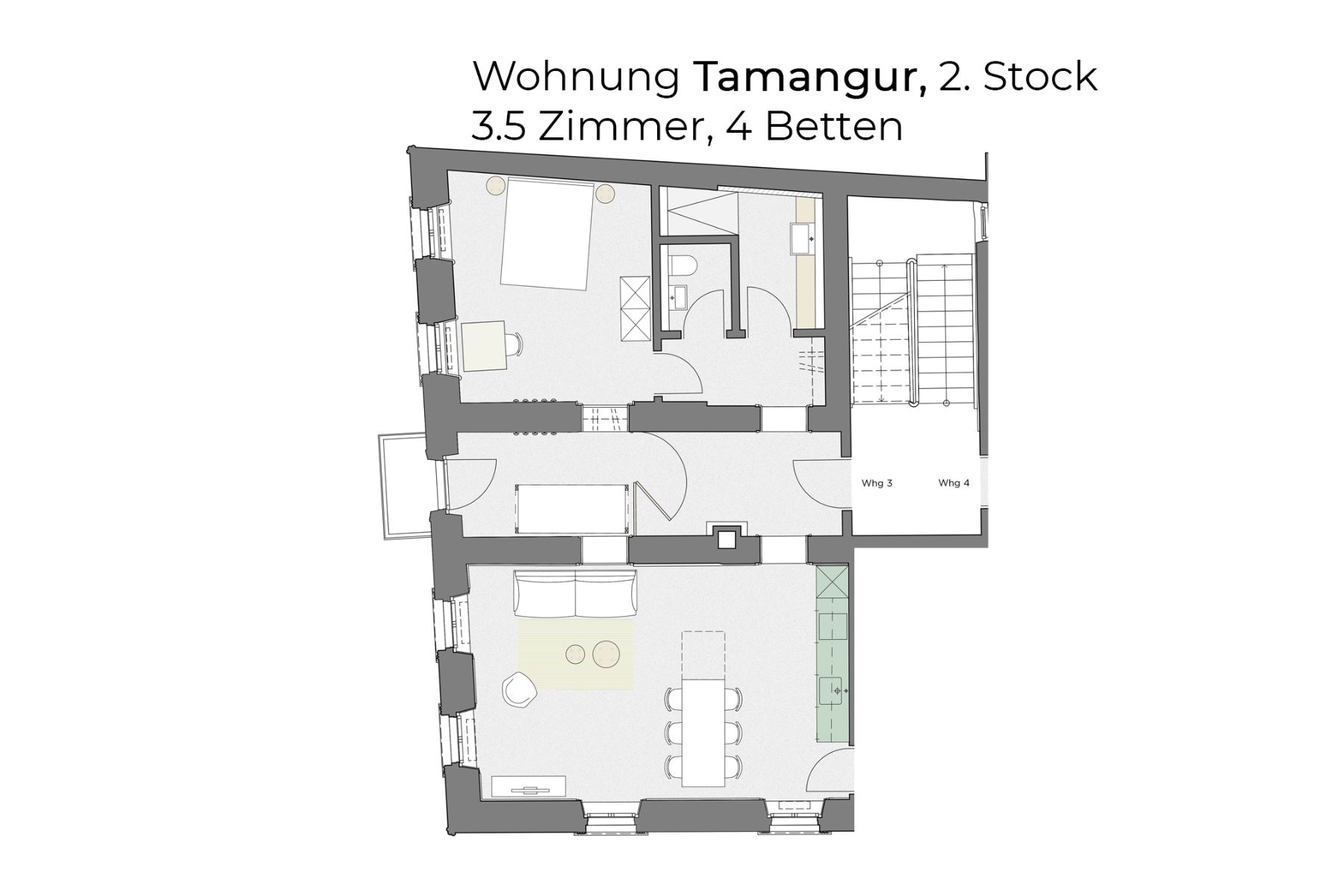 «God da Tamangur» – was so herrlich klingt bedeutet auf Deutsch «der Wald da hinten». Gemeint ist damit der höchstgelegene zusammenhängende Arvenwald Europas. Er gedeiht auf 2300 Metern, zuhinterst im Val S-charl südlich von Scuol. Zauberhaft und beständig, wie diese Wohnung.
